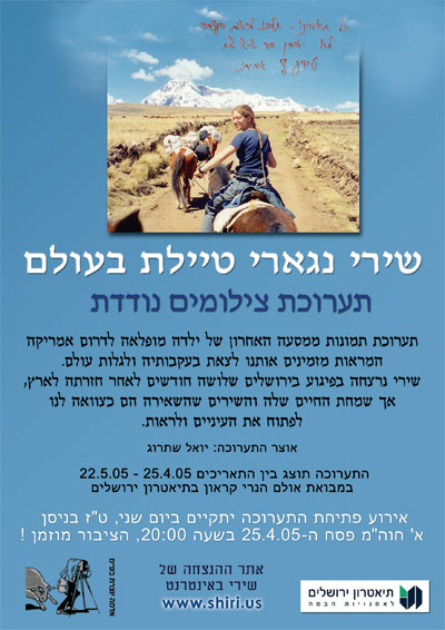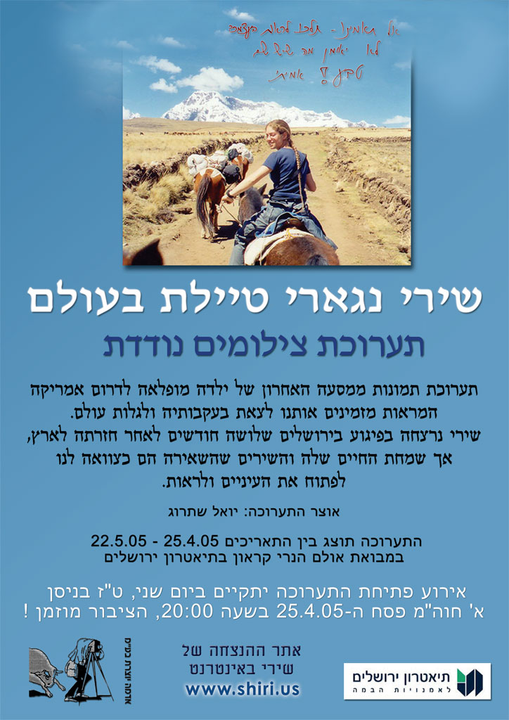 Photography Exhibition Arrives to Jerusalem Jerusalem Theater 25.4-22.5.2005 Henry Crown Entrance Hall Opening hours: Sun-Thu 17:00-21:30 Fri 12:00-15:00 Sat: Till 21:30 |
